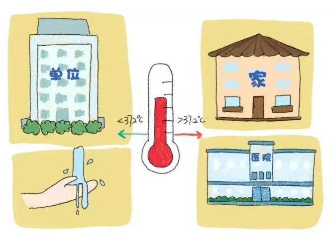 進入辦公樓前自覺接受體溫檢測,體溫正常可入樓工作,并到衛(wèi)生間洗手。若體溫超過37.2℃,請勿入樓工作,并回家觀察休息,必要時到醫(yī)院就診。
