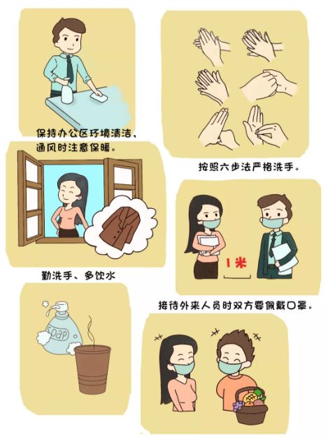 保持辦公區(qū)環(huán)境清潔,建議每日通風3次,每次20-30分鐘,通風時注意保暖。人與人之間保持1米以上距離,多人辦公時佩戴口罩。保持勤洗手、多飲水,堅持在進食前、如廁后按照六步法嚴格洗手。接待外來人員雙方佩戴口罩。