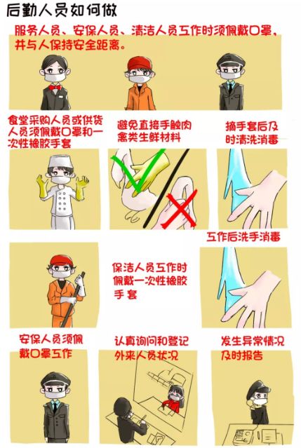 服務人員、安保人員、清潔人員工作時須佩戴口罩,并與人保持安全距離。食堂采購人員或供貨人員須佩戴口罩和一次性橡膠手套,避免直接手觸肉禽類生鮮材料,摘手套后及時洗手消毒。保潔人員工作時須佩戴一次性橡膠手套,工作結束后洗手消毒。安保人員須佩戴口罩工作,并認真詢問和登記外來人員狀況,發(fā)現(xiàn)異常情況及時報告。