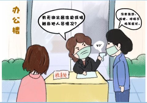 須佩戴口罩。進入辦公樓前首先進行體溫檢測,并介紹有無湖北居住史或接觸當?shù)厝藛T情況,以及有無發(fā)熱、咳嗽、呼吸不暢等癥狀。無上述情況,且體溫在37.2°正常條件下,方可入樓公干。