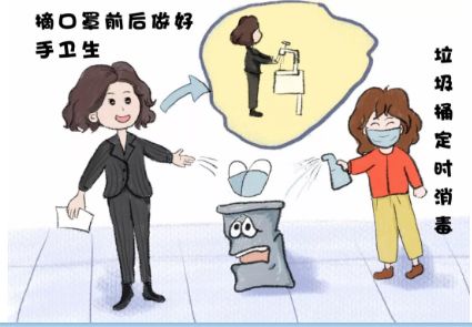 防疫期間,摘口罩前后做好手衛(wèi)生,廢棄口罩放入垃圾桶內(nèi),每天兩次使用75%酒精或含氯消毒劑對垃圾桶進行消毒處理。