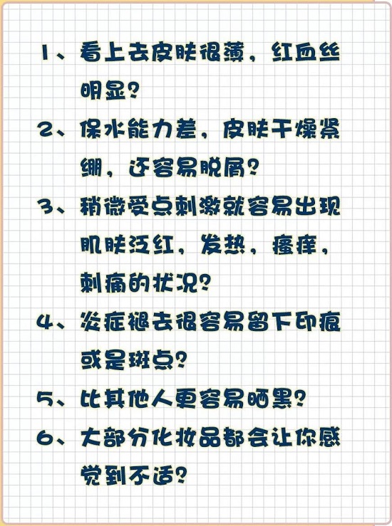 如果你有以上癥狀,那你就要注意了,你可能就是敏感肌。敏感肌通常表現為:面部肌膚極薄,紅血絲明顯、對成分不夠溫和的化妝品和護膚品極易過敏、皮膚極易因季節和溫度、環境等變化而變得不穩定等。