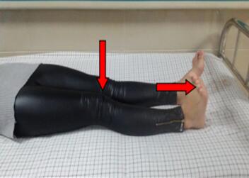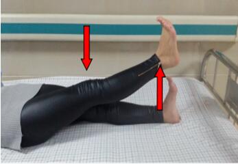 取仰臥位,膝關節盡量伸直,大腿前方的股四頭肌收緊,踝關節盡量背伸,緩慢抬起整個下肢約15cm,保持5-10秒,再保持同樣姿勢緩慢放下,兩腿交替以上動作。抬高、放下為一次,15次為1組,每天3組。
