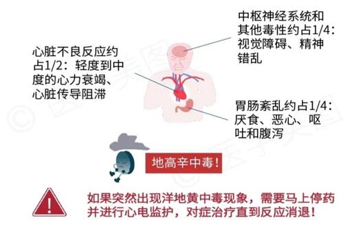 副作用 地高辛的副作用主要表現(xiàn)為胃腸道反應(yīng)、神經(jīng)系統(tǒng)反應(yīng)和心臟毒性三個(gè)方面。惡心、嘔吐、腹痛、厭食等胃腸道反應(yīng)是早期癥狀。神經(jīng)系統(tǒng)反應(yīng)有頭痛、憂郁、無力、失眠、視力模糊等,黃視癥和綠視癥等視色障礙為嚴(yán)重中毒的信號(hào)。心臟毒性主要表現(xiàn)為各種心律失常,如室性早搏、陣發(fā)性室上性和室性心動(dòng)過速。