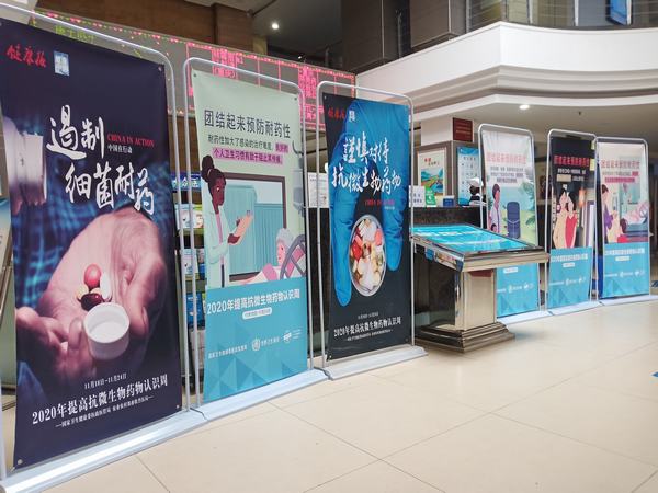 活動現場布置主題橫幅,陳列抗微生物藥物合理使用宣傳海報。