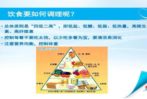 2.合理飲食:以低鹽低脂、清淡易消化飲食為主,飲食規律,每餐進食七分飽,避免暴飲暴食,多吃富含粗纖維的蔬菜水果,如芹菜、菠菜、胡蘿卜、香蕉、蘋果、獼猴桃等,保持大便通暢、勿屏氣用力排便,以免誘發心肌缺血現象;合并高血糖、糖尿病患者應嚴格控制水果攝入量,多食優質蛋白:蝦、魚類、雞肉、瘦豬肉、豆制品。每日食用油量25g,用鹽量不超過6g,約1啤酒瓶蓋。口味偏咸有很多弊端,可升高血壓、引起動脈粥樣硬化,限制鈉鹽攝入量。每天飲水2000ml左右可以保證機體基礎水分需求。
