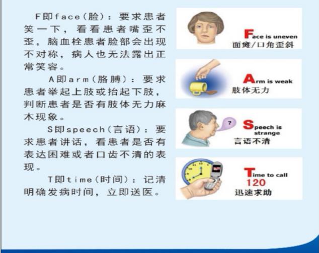 以上是我為大家整理的腦血管病人居家護理要點。下面為大家附上快速識別腦卒中的方法,如發(fā)現(xiàn)有圖中的癥狀,立即就診。春節(jié)期間延安大學咸陽醫(yī)院神經(jīng)內(nèi)科貴賓二病區(qū)24小時免費接診電話3378 6067。最后祝您春節(jié)快樂,身體健康!