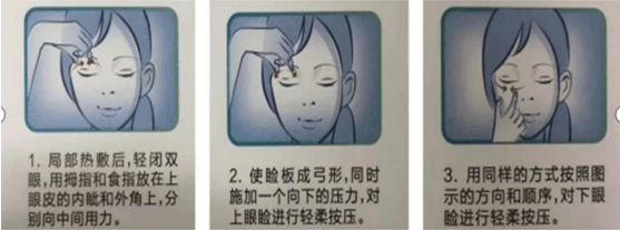 第三步:舒緩按摩,輕閉雙眼,用拇指和食指放在上眼皮的內(nèi)眥部和外眼角上,分別向中間用力按壓;使瞼板呈弓形,同時施加一個向下的壓力,對上眼瞼進(jìn)行輕柔按壓;用同樣的方法按照圖示的方向和順序,對下眼瞼進(jìn)行輕柔按壓。 如果分泌物較多,要進(jìn)行二次清潔。