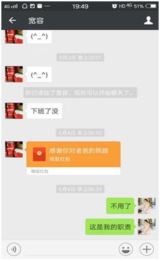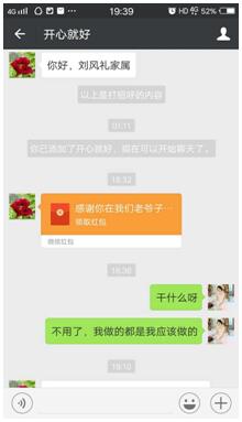 趙阿娟曾經(jīng)護(hù)理過(guò)一位病人,因?yàn)榧?xì)心的護(hù)理和照料,家屬對(duì)她感激不已,兩位家屬先后希望以微信紅包的方式表達(dá)他們的感謝:“阿娟,老爺子在病重期間得到你悉心的照料,老人特別感激你,經(jīng)常對(duì)我們說(shuō)要好好感謝你。現(xiàn)在老人走了,我們替老人完成他未了的心愿,以表達(dá)我們的感激之情。錢(qián)不多,可這是我們?nèi)业男囊猓?qǐng)收下紅包,不要讓老人心里有遺憾。本來(lái)想給孩子買(mǎi)點(diǎn)吃的,但是不方便給你。如果你不領(lǐng)紅包,我們心里會(huì)很難過(guò)。”