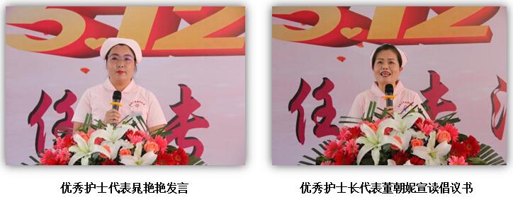 我院優秀護士代表晁艷艷發言,表示不負榮譽、再接再厲,為醫院護理工作再做貢獻。優秀護士長代表董朝妮發出倡議,以患者為中心,用心、用情、用專業態度完成每一項工作,確保患者的安全;探索延續護理服務模式,做好慢性病患者的健康管理。