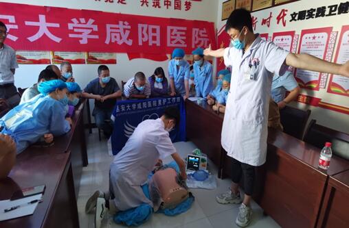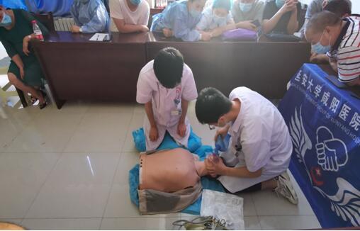 為進一步增強居民健康意識,開展健康宣教走進基層活動,2020年6月19日下午,延安大學咸陽醫(yī)院男護工作組前往正陽鎮(zhèn)衛(wèi)生院,對衛(wèi)生院的醫(yī)務人員進行心肺復蘇術和海姆立克急救法操作指導。