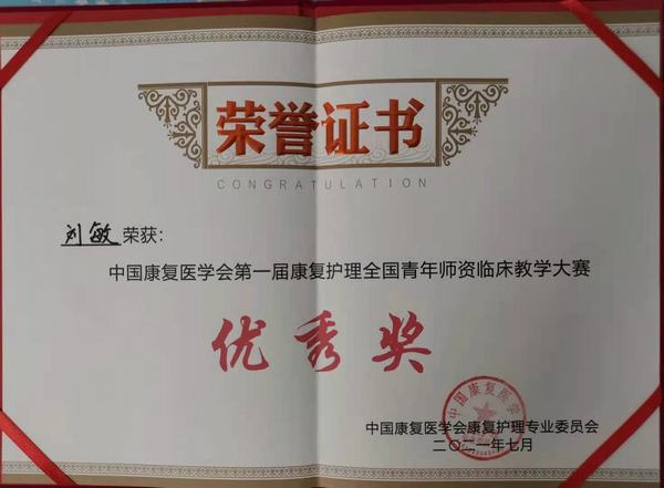 熱烈祝賀我院康復(fù)醫(yī)學(xué)科劉敏護(hù)士長榮獲“中國康復(fù)醫(yī)學(xué)會(huì)第一屆康復(fù)護(hù)理全國青年師資臨床教學(xué)大賽”優(yōu)秀獎(jiǎng)