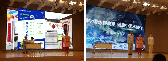 本次比賽,我院護理部高度重視,層層選拔人員,時時關注進度,并邀請具有比賽經驗和演講功底的老師進行全程指導。《肌細胞歷險記》由張莎扮演肌細胞、灰猛強扮演患者王大爺、董星辰演繹康復專科護士,以肌細胞為第一人稱生動的講述了它的歷險經歷,而王大爺也形象的還原了生活中患者的真實情況,十分有代入感,康復專科護士則通過扎實的專業知識通俗易懂的指導患者正確康復運動,體現了康復專科護士在腦卒中患者康復過程中的價值。除此之外,作品還強調了快速識別腦卒中的重要性以及溶栓治療的及時性。