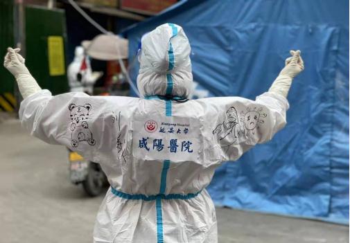 “圣保羅曾說‘這個世界上有三樣?xùn)|西對人類是最重要的——信、望、愛’。我們被稱作白衣天使,向群眾傳遞抗疫必勝的信念,讓她們看到勝利的曙光,感受到醫(yī)務(wù)人員的仁愛之心,這與核酸采集工作同樣重要。因為采集任務(wù)較重,且有口罩和面屏的遮擋,語言交流不是很順暢,我們便選擇了在防護服上涂鴉。”采樣隊組長劉曦這樣解釋。