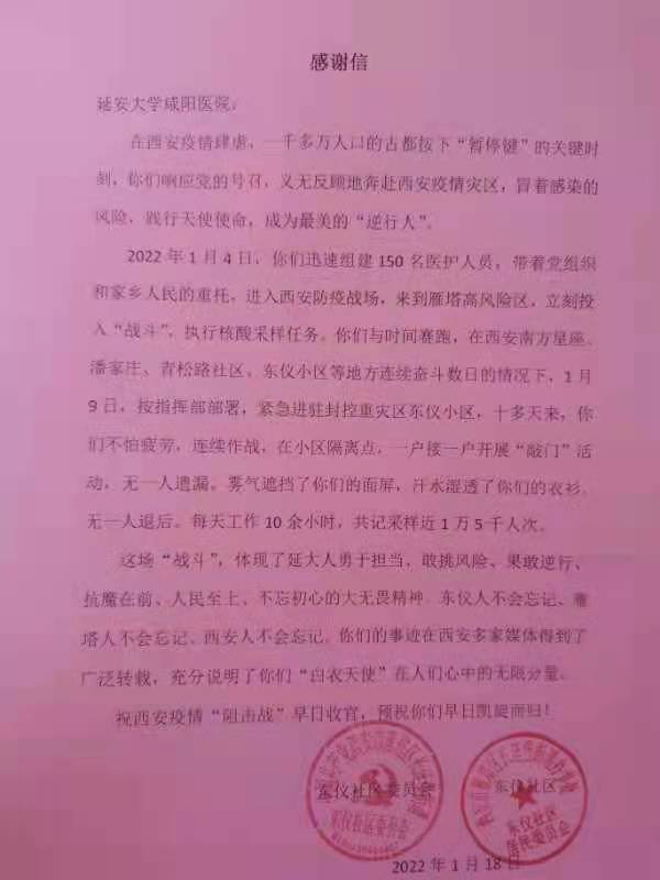 2022年1月18日——支援西安的第15天。延安大學咸陽醫院收到來自中國共產黨西安市雁塔區長延堡街道東儀社區委員會的感謝信。信中寫到:這場“戰斗”體現了延大人“勇于擔當、敢挑風險、果斷逆行、抗魔在前、人民至上、不忘初心”的大無畏精神。