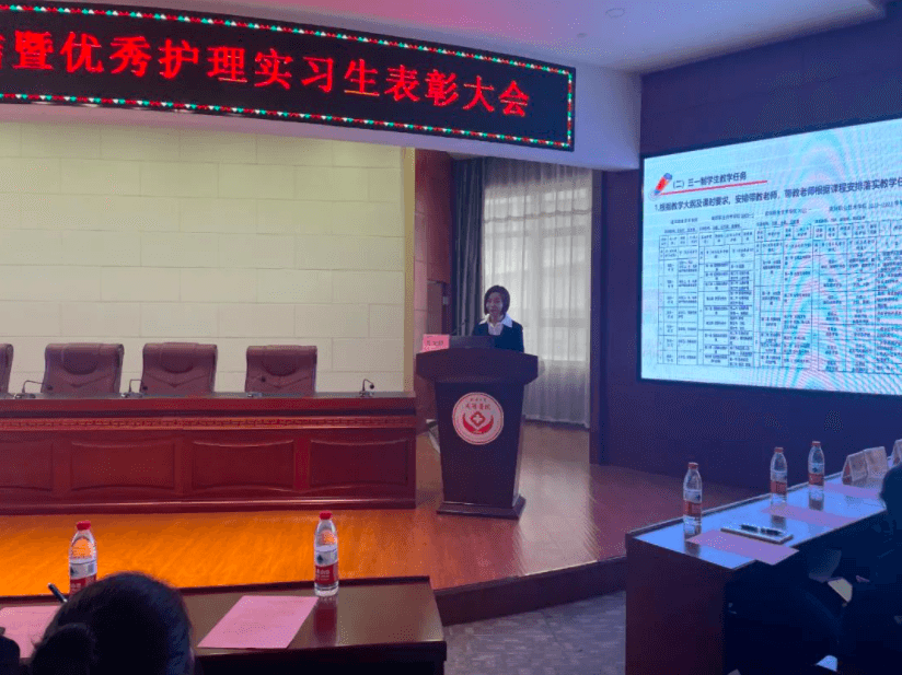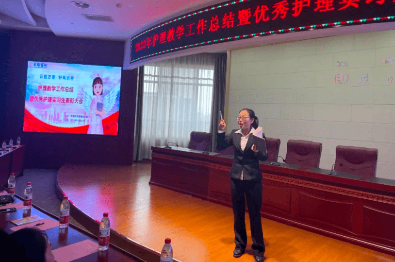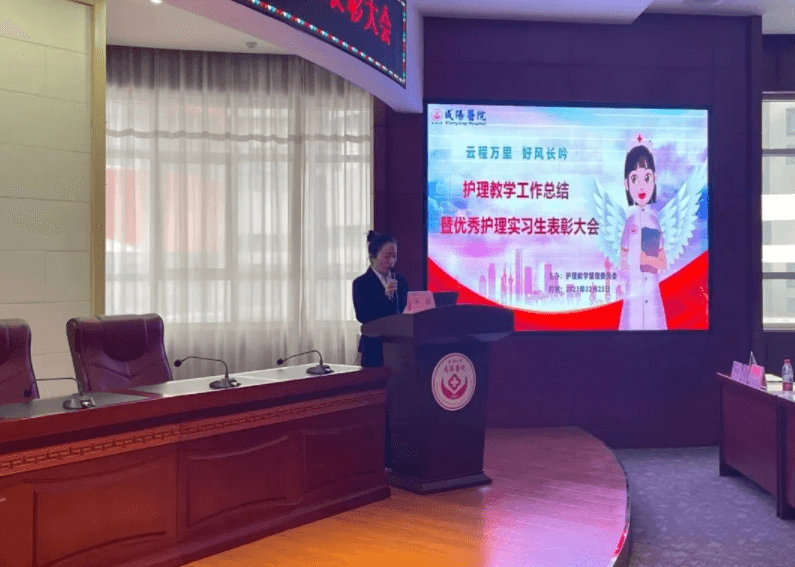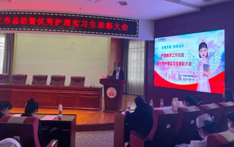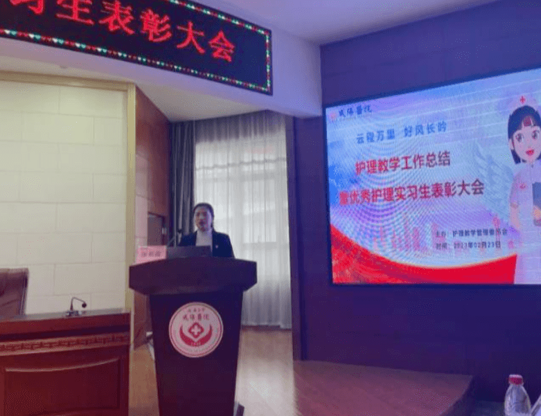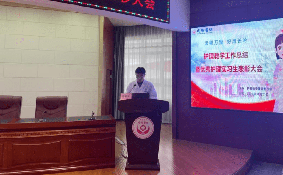 2023年2月23日下午兩點,延安大學咸陽醫院護理教學管理委員會在腦血管病院第三學術廳召開了“2022年度教學工作總結暨優秀護理實習生表彰大會”,本次會議由教學干事孫姣姣主持,楊敏院長助理、黨文婷總護士長、教學管理委員會全體成員及在院的200名護理實習生參加本次會議。