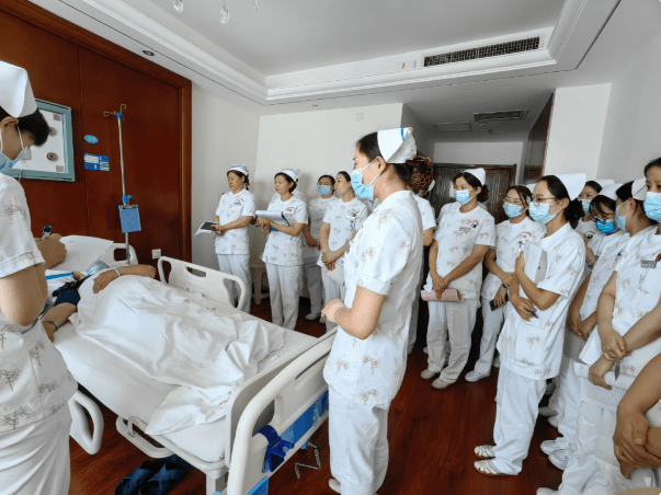 查房結束,黨文婷總護長從匯報病例、護理評估、護理診斷與措施、健康教育等方面進行點評,提出從不同專業視角出發,借助綜合專科護理力量,共同為患者制定規范化、個體化、連續性的綜合護理措施,精準高效的解決護理難題,給予患者全面優質的護理服務,讓專科技能,專業技術惠及到所有患者。
