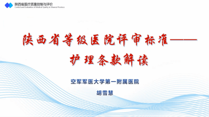 中華護理學(xué)會副理事長、西京醫(yī)院護理部胡雪慧主任詳細解讀了陜西省等級醫(yī)院評審細則中護理專業(yè)的9個責(zé)任條款,針對護理管理組織體系、護理人力資源管理、護理質(zhì)量管理與持續(xù)改進、護理安全管理及特殊護理單元質(zhì)量管理與監(jiān)測,從護理部層面、科室層面和護士層面分別剖析了迎評準備。號召護理人員深入貫徹“以評促改、以評促建、評建結(jié)合、重在改進”的評審理念,加強內(nèi)涵建設(shè),完善管理、優(yōu)化流程,進一步提高服務(wù)能力,助力醫(yī)院高質(zhì)量發(fā)展。