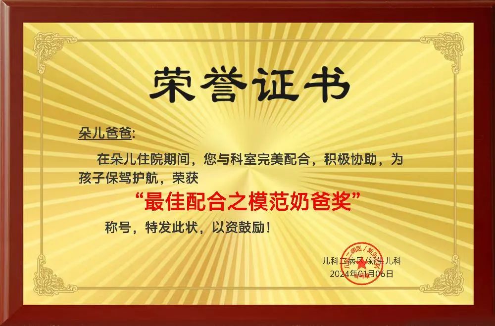 在接下來的幾天,朵爸說話也變得穩(wěn)重從容了,也不煩躁了,每次見到我都是笑嘻嘻的,住院第七天復查,結(jié)果都正常,順利出院,在出院當天我送給朵爸一本“最佳配合之模范奶爸”的獎狀,并讓朵爸掃描家屬微信群,群里每天會發(fā)科普視頻和小知識,與眾多家屬共同學習。朵爸開心的像個孩子,點頭說太好啦。所有醫(yī)護人員都對朵爸贊許不斷,為朵爸豎起大拇指。一家人都很感激在住院期間遇到了像我這樣特別的護士。