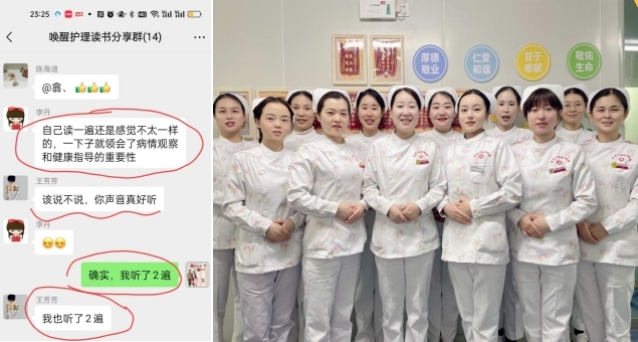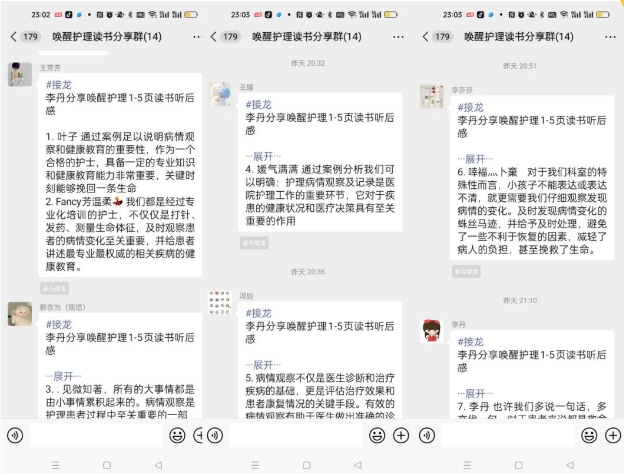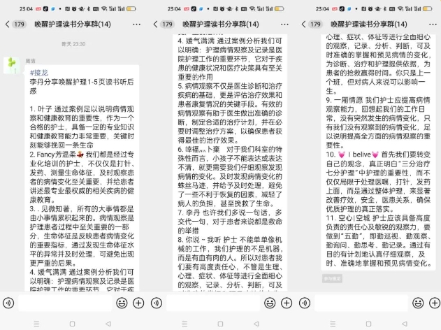 第一天讀書分享后,我主動帶頭將聽書后感想發(fā)至群內,護士姐妹們熱情高漲,讀書聽書積極性很高,分別接龍分享了自己聽書后的感想,丹丹護士表達“自己讀一遍還是感覺不太一樣的,一下子就領會了病情觀察和健康指導的重要性”。芳芳護士分享“我們都是經過專業(yè)化培訓的護士,不僅僅是打針、發(fā)藥、測量生命體征,及時觀察患者的病情變化至關重要,并給患者講述最專業(yè)最權威的相關疾病的健康教育......”大家分別分享著自己的心得體會,沉浸在讀書的氛圍中……