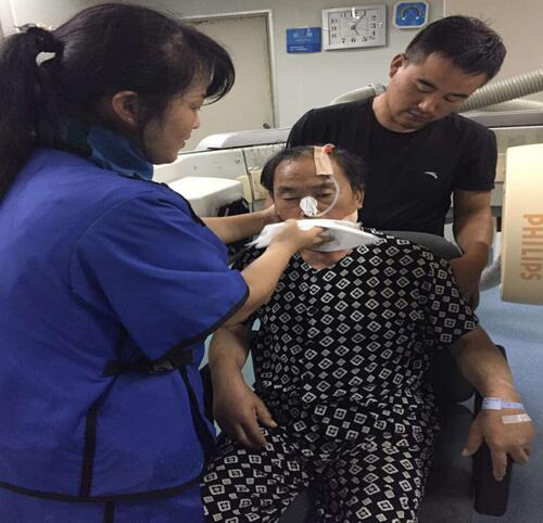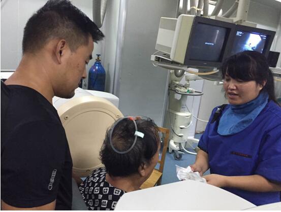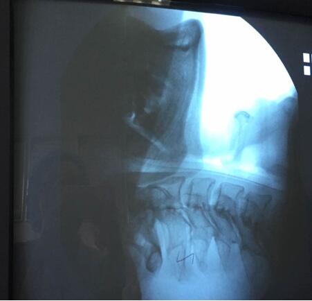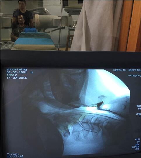 該患者于6月23日在山東濰坊因腦干梗死出現吞咽功能減退,并在當地一家醫院進行檢查與治療,之后轉入我院進行診治,經過詳細的資料查詢和反復思索,我院康復醫學科責任總治療師梁莉娜大膽提出開展吞咽造影檢查的設想,隨即與介入導管室積極協調,制定了詳細的實施方案,于7月14日順利完成檢查。最終,初步檢查造影結果為吞咽障礙(咽期)、誤吸、環咽肌不完全開放。