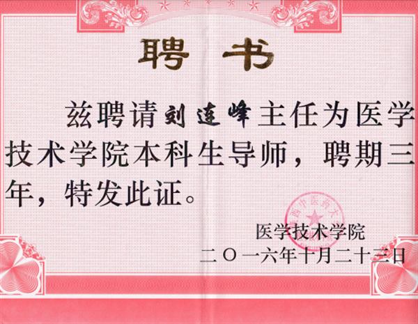 熱烈祝賀我院劉連鋒同志獲聘為陜西中醫藥大學醫學技術學院本科生導師