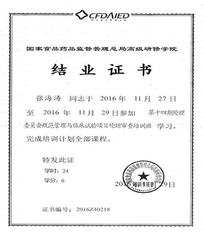 2016年11月27日,我院醫學倫理委員會主任委員張海濤副院長受邀參加了國家食品藥品監督管理總局高級研修學院在安徽省合肥市舉辦的第十四期倫理委員會規范管理與臨床試驗項目倫理審查培訓班。