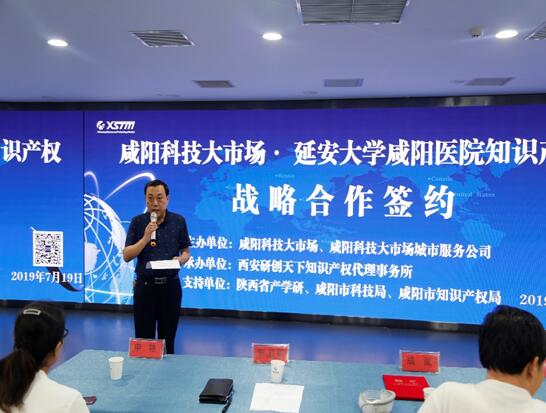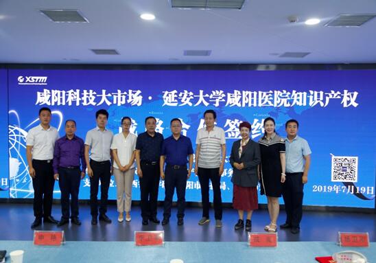 2019年7月19日上午,延安大學咸陽醫院與咸陽市科技大市場在創業大廈5樓簽訂知識產權戰略合作協議。陜西省工信廳產學研主任楊衛剛、咸陽市科技局副局長成胤、延安大學咸陽醫院董事長李衛軍、咸陽市科技資源統籌中心副主任申艷、咸陽科技大市場總經理張秋、延安大學咸陽醫院科研教學管理中心主任韓曉芳、延安大學咸陽醫院科教部副部長王紹輝等30余人出席了此次會議。延安大學咸陽醫院董事長李衛軍代表醫院簽訂本次協議。
