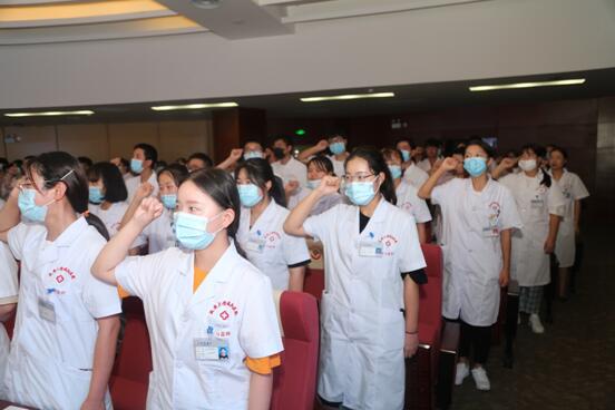 歡迎儀式上,科教部王紹輝副部長代表醫院對實習生來院學習表示歡迎,并對醫院的基本情況進行了介紹,隨后對大家在醫院的學習生活提出幾點寶貴的意見,希望同學們能迅速從思想上完成角色定位和轉變,更好、更快的適應新環境,以滿腔熱情投身于實習中去,做一個文化素養與專業素質兼備的醫學人。隨后,學生代表陳浩帶領全體實習生進行宣誓。