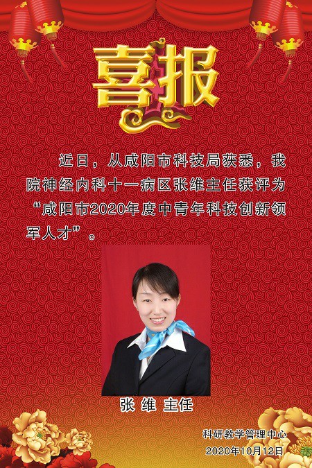 近日,從咸陽(yáng)市科技局獲悉,我院神經(jīng)內(nèi)科十一病區(qū)張維主任榮膺“咸陽(yáng)市2020年度中青年科技創(chuàng)新領(lǐng)軍人才” 稱號(hào)!