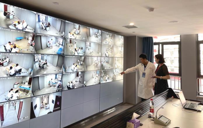 院領(lǐng)導(dǎo)韓曉芳與總考官李鵬在中控室實時監(jiān)控