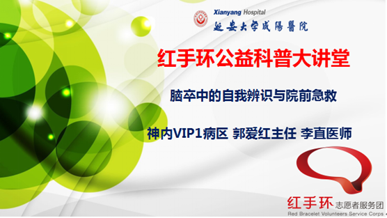 為進(jìn)一步提高咸陽(yáng)地區(qū)人民群眾對(duì)腦卒中防治知識(shí)知曉率和控制率,倡導(dǎo)人民群眾健康的生活方式,實(shí)現(xiàn)腦卒中的早期預(yù)防、早期診斷、早期治療,降低腦卒中發(fā)病率、復(fù)發(fā)率、致殘率及死亡率。11 月 04 日上午,我院神經(jīng)內(nèi)科貴賓一病區(qū)紅手環(huán)志愿者服務(wù)團(tuán)的志愿者們以實(shí)際行動(dòng),踐行紅手環(huán)精神,開(kāi)展了紅手環(huán)公益科普大講堂,獲得了巨大的反響。