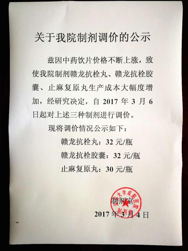 茲因中藥飲片價(jià)格不斷上漲,致使我院制劑贛龍抗栓丸、贛龍抗栓膠囊、止麻復(fù)原丸生產(chǎn)成本大幅度增加,研究決定,自2017年3月6日起對(duì)上述三種制劑進(jìn)行調(diào)價(jià)。