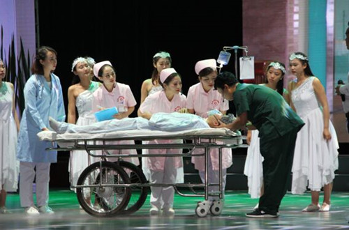 情景劇《守望》是根據(jù)在我院發(fā)生的真實故事改編而成,講述的是13名醫(yī)護人員經(jīng)過6個小時的分秒必爭,終于將一名70多歲的老人從死亡線上拉回來的故事,老人在昏迷之際隱約聽到家屬與醫(yī)護之間的交流,醒來的第一件事竟是在紙上寫下了“護士沒吃飯”五個字。事情發(fā)生后,全國各大媒體爭相報道,事跡感動了億萬人。節(jié)目通過朗誦與情景相結(jié)合的藝術(shù)表現(xiàn)形式,演繹醫(yī)患關(guān)系漸漸回歸到人性的本真。我院愛心藝術(shù)團精彩的表演引起了臺下觀眾的強烈共鳴,感動了在場的千余名觀眾,掌聲經(jīng)久不息。