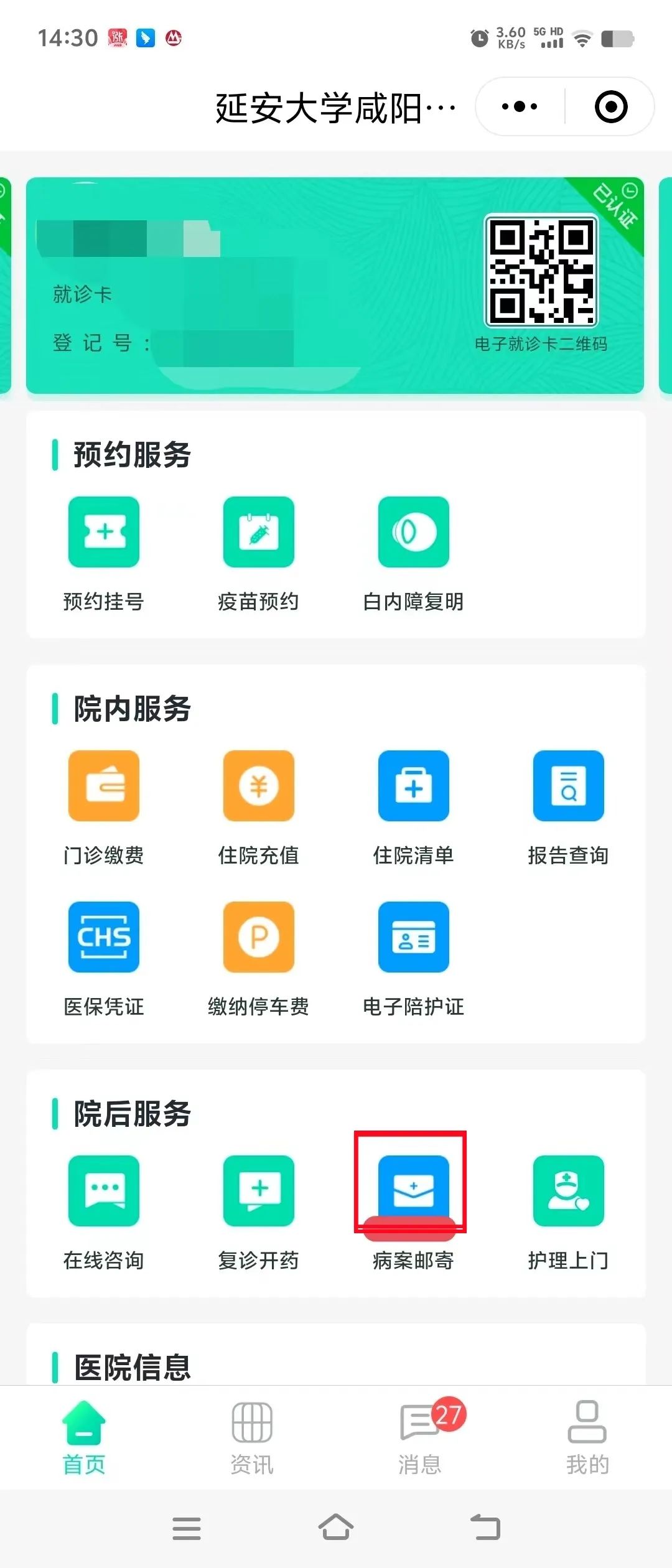 第1步:首先進入延安大學咸陽醫院互聯網醫院,點擊電子就診卡進行注冊綁卡實名認證。