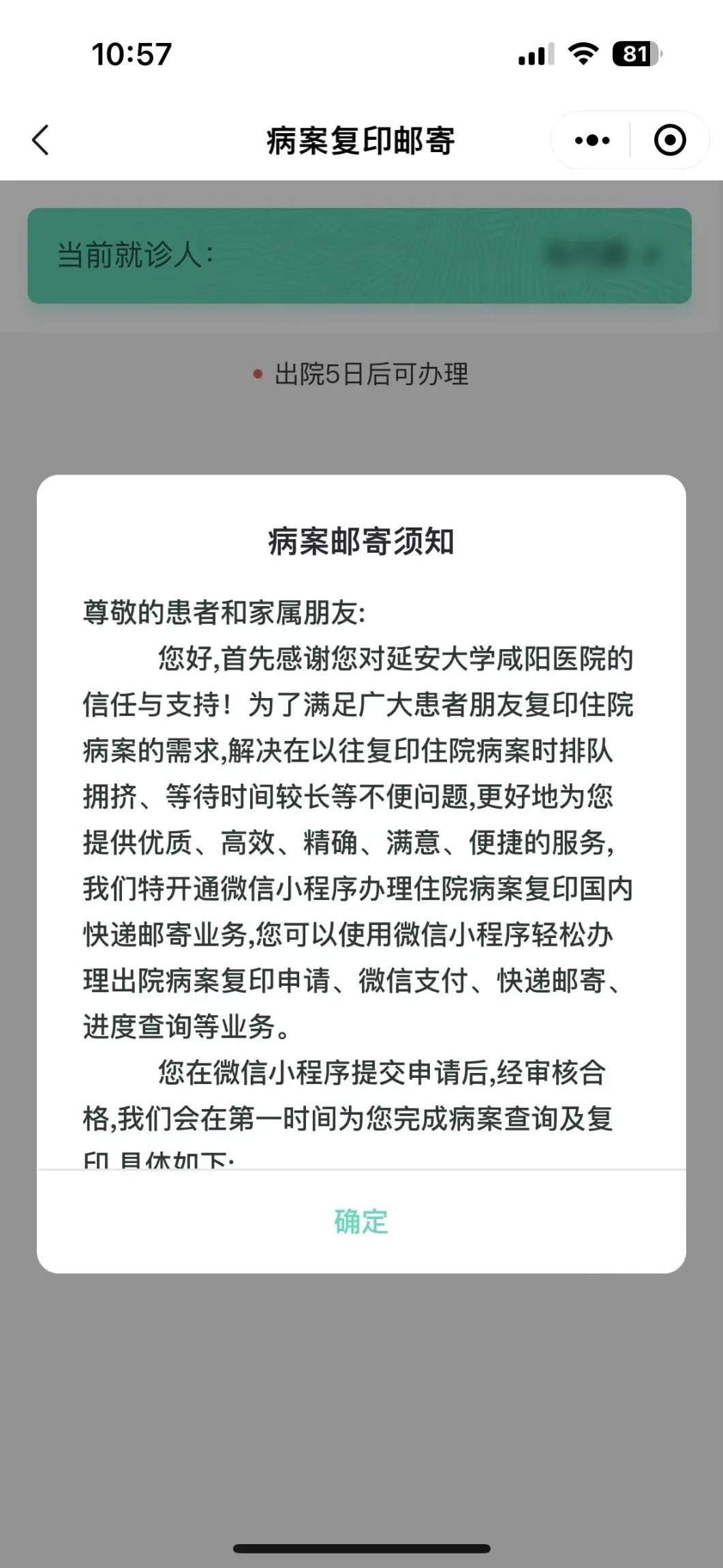 第2步:點擊【病案郵寄】,閱讀查看【病案郵寄須知】并選擇確認。