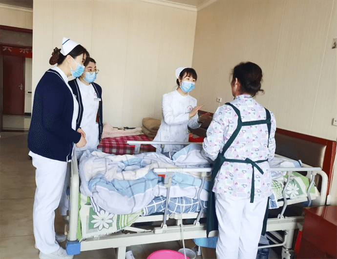 最后,康復醫(yī)學科劉敏護士長帶領專業(yè)組成員進入公寓內(nèi)部,對部分失能老人進行護理查房,現(xiàn)場指導養(yǎng)老院的工作人員照護方式。劉敏護士長、徐莉護士長對一例股骨轉(zhuǎn)子間骨折長期臥床的老人進行了康復鍛煉、營養(yǎng)支持、并發(fā)癥預防方面的指導;劉文靜護士長、張雨護師對兩例帕金森患者的服藥、功能訓練等進行指導;趙小飛護士長、劉昱宏主管護師查看了一例壓力性損傷患者及一例失禁性皮炎患者,對傷口處理、失禁管理進行指導。