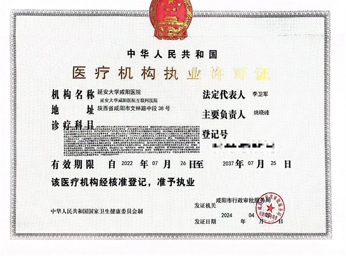為深入貫徹落實(shí)習(xí)近平新時代中國特色社會主義思想和黨的十九大精神,推進(jìn)實(shí)施健康中國戰(zhàn)略,根據(jù)《“健康中國2030”規(guī)劃綱要》等文件精神,延安大學(xué)咸陽醫(yī)院啟動互聯(lián)網(wǎng)醫(yī)院籌備建設(shè)工作。2023年11月經(jīng)陜西省衛(wèi)生健康委互聯(lián)網(wǎng)醫(yī)療監(jiān)管平臺接入審核批準(zhǔn),2024年4月22日,由咸陽市行政審批局審批通過,延安大學(xué)咸陽醫(yī)院正式獲批互聯(lián)網(wǎng)醫(yī)院牌照,取得《延安大學(xué)咸陽醫(yī)院互聯(lián)網(wǎng)醫(yī)院》為機(jī)構(gòu)名稱。