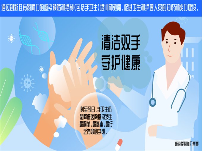 懸掛手衛生宣傳標語,制作宣傳海報,營造手衛生文化氛圍,呼吁醫務工作者通過保持手部衛生的行動來減少細菌傳播。促使民眾增強手衛生意識,倡導全民行動。