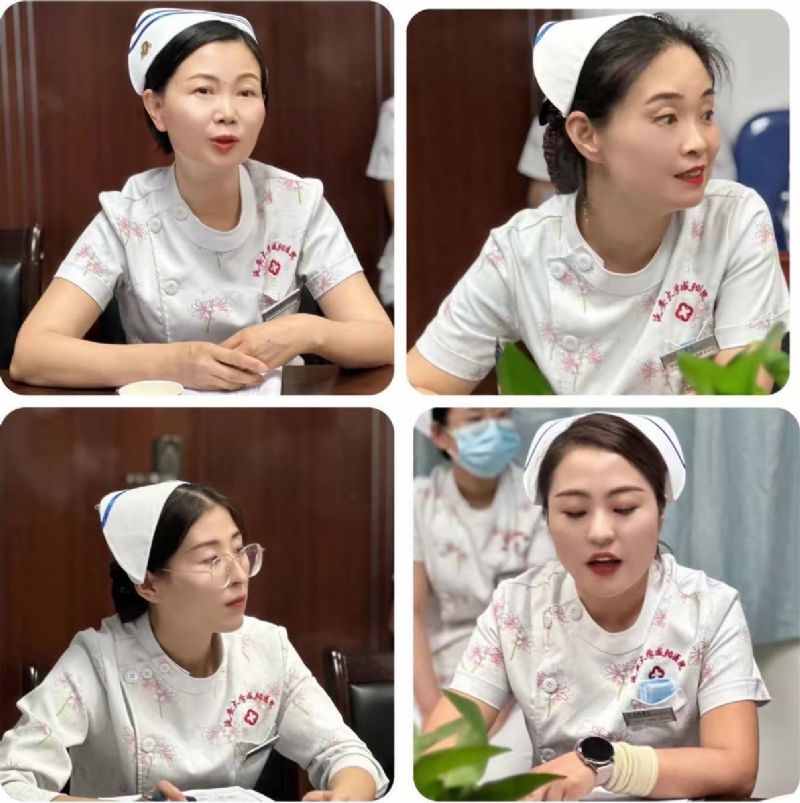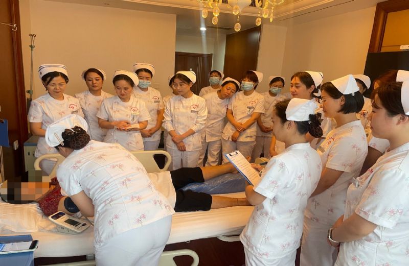崔琳護士長根據2023年中華護理學會團體標準《住院患者靜脈血栓栓塞癥預防護理與管理專家共識》和《周圍血管血栓性疾病置管溶栓護理專家共識》對術前患者是否可以進行踝泵運動和下肢周長測量方法進行討論,并指導對患者術后下肢輕度水腫用硫酸鎂濕敷:1/4硫酸鎂粉劑+200ml水浸濕毛巾對患肢包裹,用保鮮膜包裹,每天3-5次,每次30min,補充了我們對此護理的不足。薛娜護士長從敘事的角度對護理宣教時機給予指導,并對茍美護士在護理過程中用敘事護理以患者為中心、尊重患者的故事、傾聽和理解等方面對患者的精心護理給予好評和肯定。在查房過程中,護理團隊針對患者的病情和護理也展開了熱烈的討論。大家各抒己見,提出了許多寶貴的建議和改進措施。例如,徐莉護士長提出及時指導臥床患者腹式呼吸,鍛煉患者心肺功能:殷本玲護士長指出對術后患者指導穿脫彈力襪、使用醫療彈力繃帶等問題給予指導。 黨文婷總護士長對本次查房進行了總結和點評,充分肯定了護理團隊的工作,并強調了護理工作中細節的重要性。護理過程中要重視患者的心理護理,表揚責任護士茍美的進步,表明把病人的需求作為中心點,有技巧的對患者進行宣教,健康宣教知曉率一定會有所提升,為患者提供更加全面、個性化的護理服務。