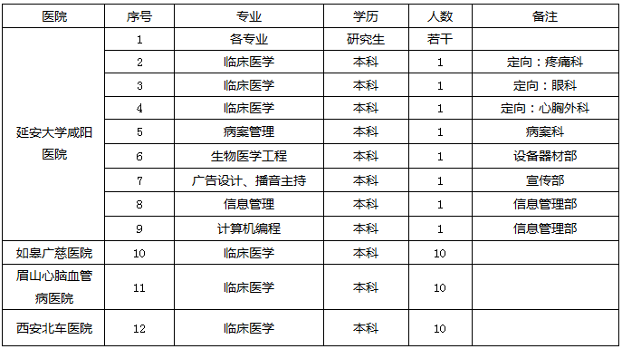 根據(jù)醫(yī)院發(fā)展需要,延安大學(xué)咸陽(yáng)醫(yī)院現(xiàn)面向社會(huì)招聘各專業(yè)醫(yī)師若干,具體要求如下: