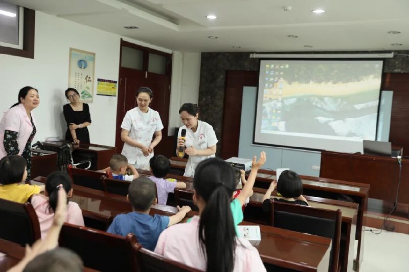 口腔病院周寧寧護士通過生動有趣的PPT和實物模型,為孩子們講解了牙齒結(jié)構(gòu)、齲齒形成的原因,教會孩子們正確刷牙方法及日常飲食中護齒知識。孩子們聽得津津有味,紛紛舉手參與互動。