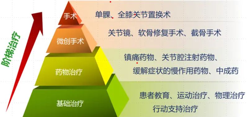 骨關(guān)節(jié)炎的治療并非只有吃藥和手術(shù),而是遵循一個(gè)科學(xué)的“階梯治療” 原則。這個(gè)概念就像爬樓梯,從最簡單、最基礎(chǔ)的生活方式干預(yù)開始,如果效果不佳,再逐步升級(jí)到更復(fù)雜的治療方案。