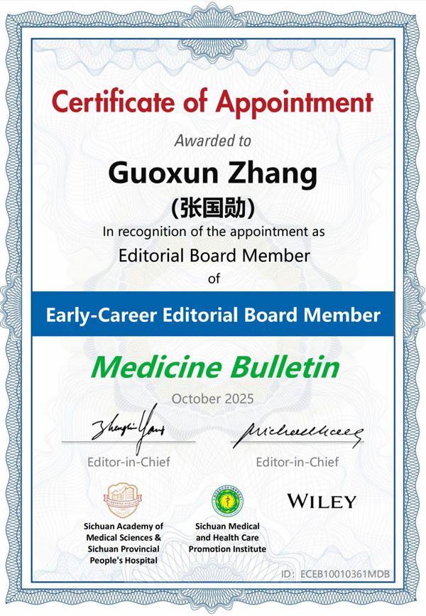 近日,延安大學咸陽醫(yī)院神經內科張國勛博士正式受邀擔任國際英文期刊《Medicine Bulletin》的青年編委。