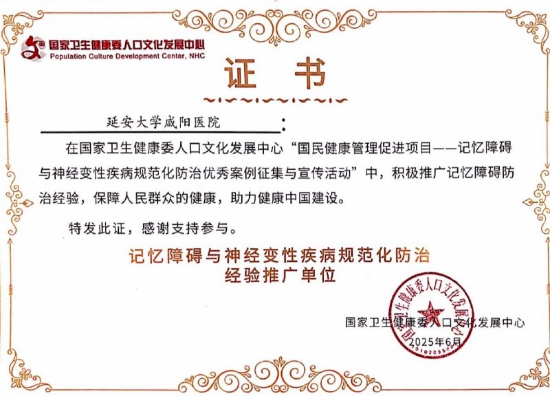 面對人口老齡化背景下認知障礙疾病高發的挑戰,延安大學咸陽醫院認知障礙??剖冀K以守護老年人群生命健康為己任。未來,醫院將以此次獲證為新起點,持續推動認知領域診療技術創新與規范化防治經驗推廣,為助力“健康中國”戰略實施、保障區域老年健康貢獻更多力量。
