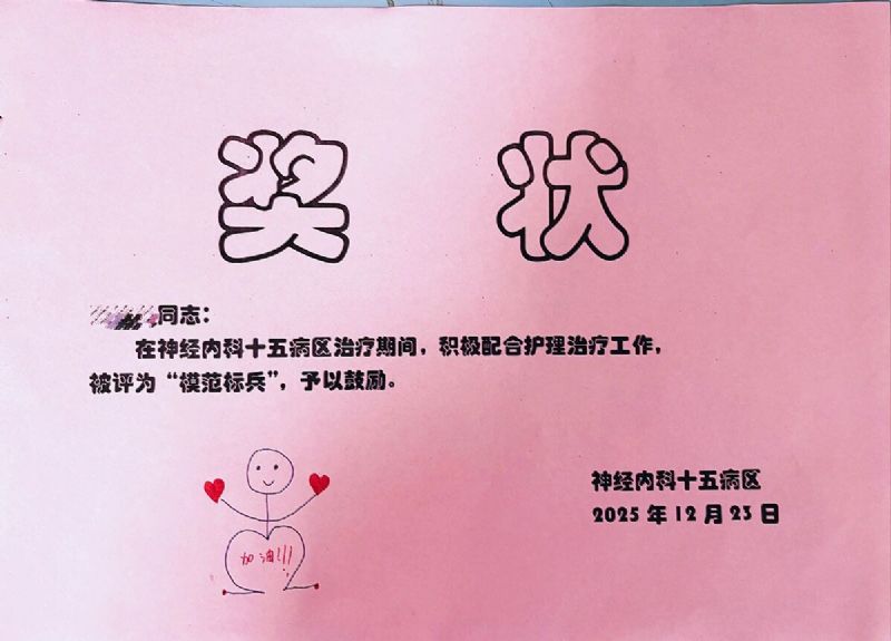 一張獎狀,拉近了醫(yī)護(hù)與患者的心,讓“敘事護(hù)理”在溫情中點(diǎn)燃康復(fù)信心。這背后,是醫(yī)者與患者共同奔赴的希望。