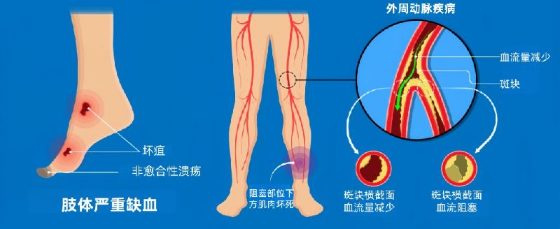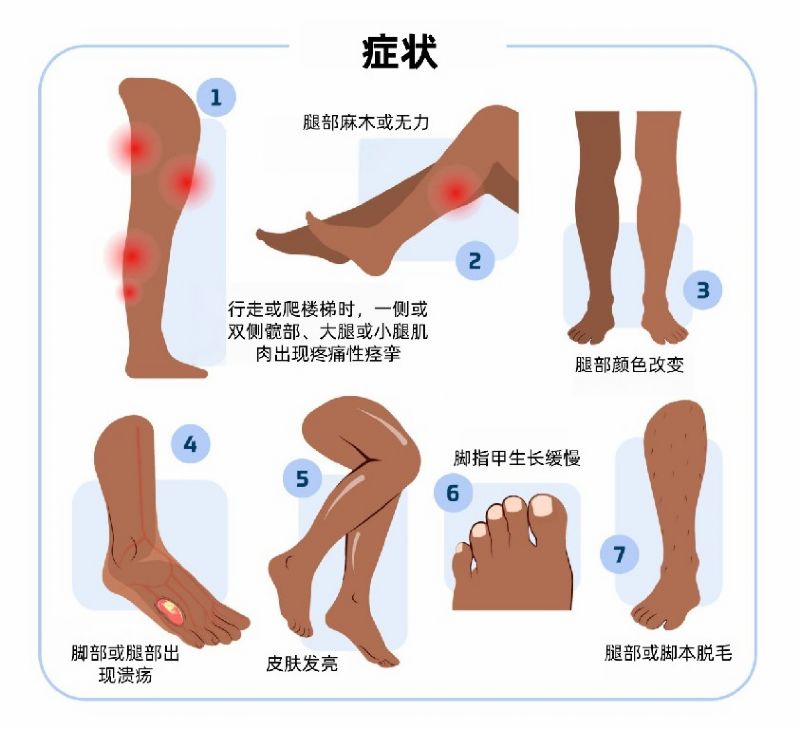 當腿部動脈“堵車”,血流減少,肌肉和組織就會缺氧,從而引發一系列癥狀:走路時腿酸、腿痛、乏力,休息后緩解,醫學上稱為“間歇性跛行”。嚴重時,即使休息時也會腳痛,傷口難以愈合,甚至可能導致組織壞死、截肢。