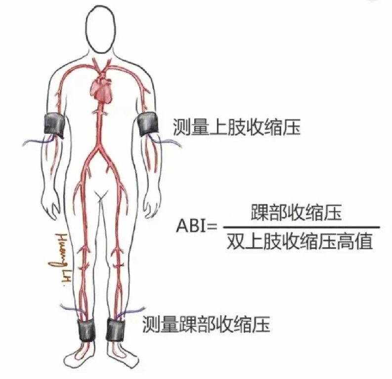 ABI測定:全稱叫“踝肱指數”。原理超級簡單:量一下腳踝的血壓,再量一下胳膊的血壓,用踝部血壓除以上臂血壓。正常人的腳踝血壓略高于胳膊,比值應該在1.0-1.3之間;如果ABI ≤0.9,即可診斷為外周動脈疾病,這是診斷PAD的“王牌武器”。