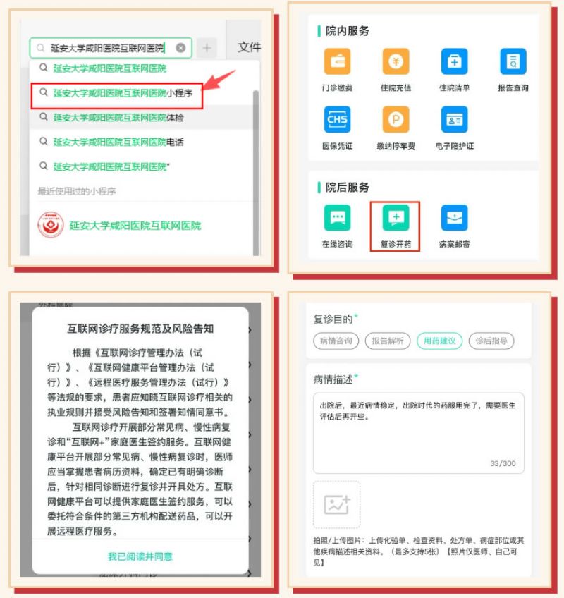 手機微信掃碼或搜索“延安大學咸陽醫院互聯網醫院”小程序 → 點擊注冊綁定【患者信息】→【復診開藥】→ 【選擇醫生】→ 【點擊閱讀并同意】→ 支付復診費用,醫生接診開方即可。