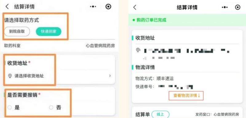 快遞到家:填寫收貨地址,藥品由醫院藥房統一發出,全國配送;
